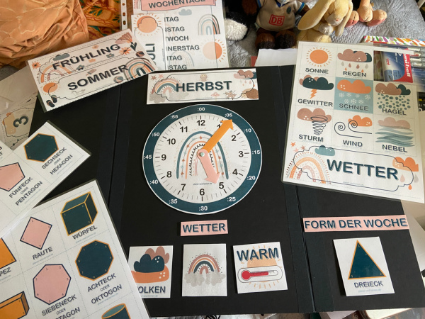 Kürzlich habe ich beschlossen, den Kalender upzugraden. Der Anblick des schwarzen Musters auf pfirsichfarbenem Grund war mir langweilig geworden, und so habe ich neue Kalenderteile mit Regenbogenmotiven versehen. Außerdem habe ich den Kalender um Jahreszeiten, Wetterkärtchen, eine Lernuhr und "die Form der Woche" ergänzt. Das gesamte Morningboard-Paket könnt ihr hoffentlich irgendwann in meinem Etsy-Shop zum Download erwerben.